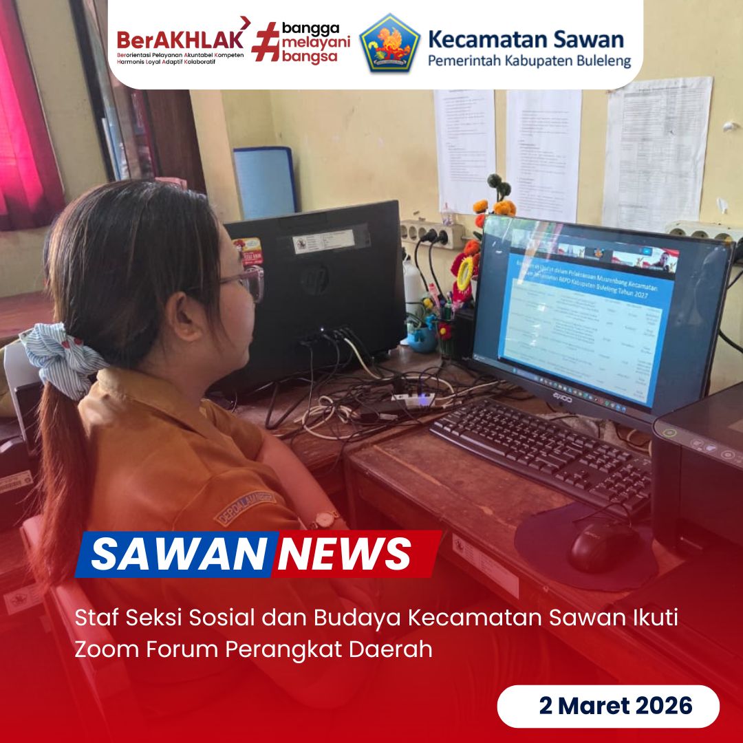 Hari ini Senin 2 Maret 2026 Staf Seksi Sosial dan Budaya (Sosbud) Kecamatan Sawan mengikuti kegiatan Zoom Meeting terkait Forum Perangkat Daerah sebagai tindak lanjut Surat Dinas Kesehatan Kabupaten Buleleng Nomor 400.7.1/730/II/2026 tanggal 26 Februari 2026. Kegiatan ini dilaksanakan dalam rangka mendukung proses perencanaan pembangunan daerah, khususnya di bidang kesehatan.