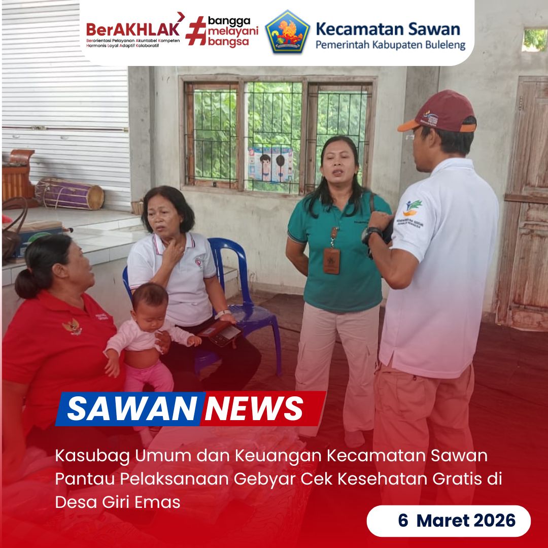 Hari ini Jumat 6 Maret 2026 Kasubag Umum dan Keuangan Kecamatan Sawan, Luh Karyani, S.Sos melaksanakan pemantauan kegiatan Gebyar Cek Kesehatan Gratis (CKG) yang berlangsung di Gedung Serba Guna Desa Giri Emas, Kecamatan Sawan.