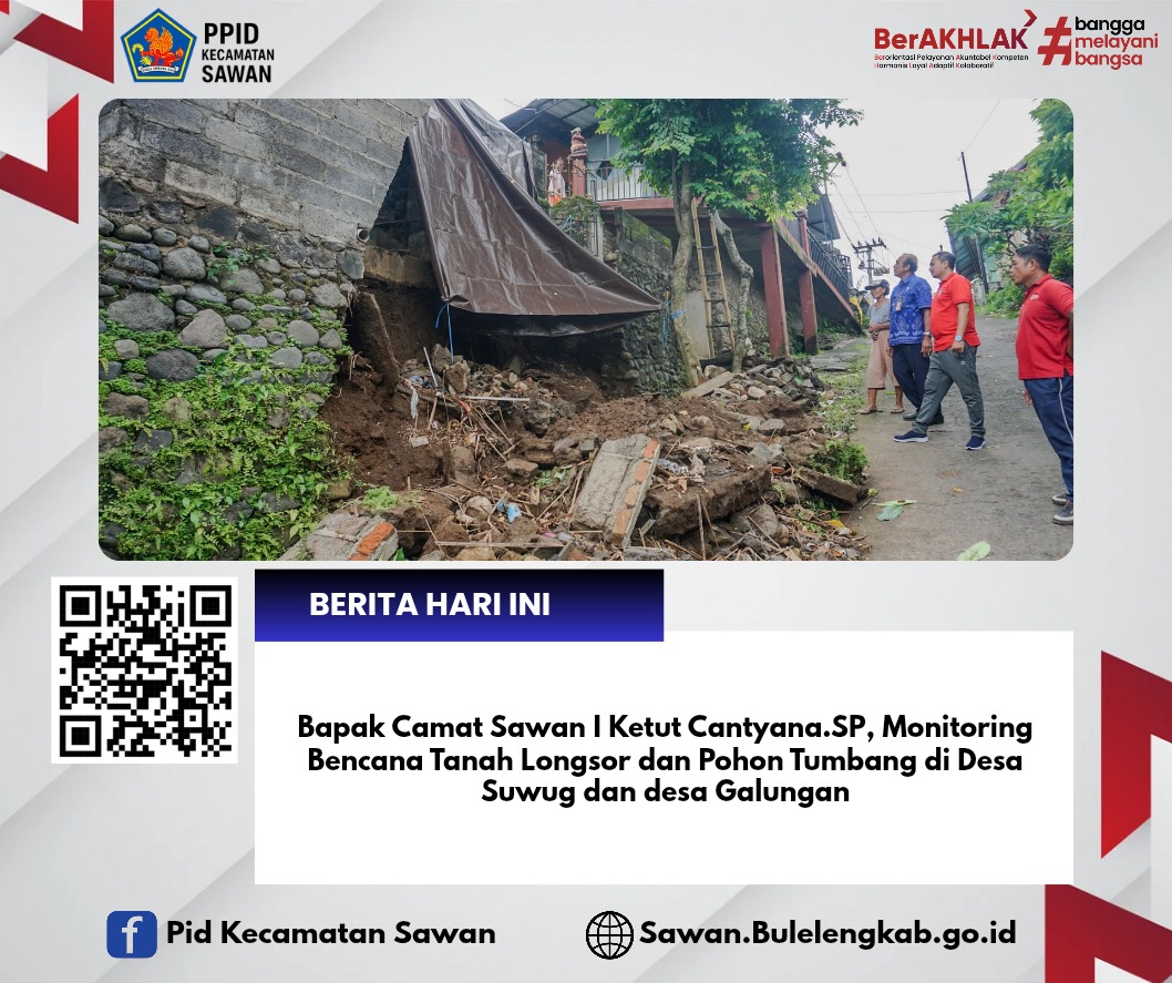 Hari ini selasa, 16 desember 2025 , Camat Sawan I Ketut Cantyana, SP., melaksanakan kegiatan monitoring sekaligus peninjauan langsung terhadap sejumlah kejadian bencana alam yang terjadi di wilayah Kecamatan Sawan, Kabupaten Buleleng, akibat curah hujan lebat yang berlangsung secara berkepanjangan. Kegiatan ini dilaksanakan bersama Perbekel setempat beserta perangkat desa, Babinsa, Bhabinkamtibmas.