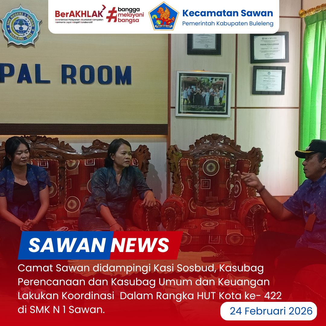 Hari ini Selasa, 24 Februari 2026 Camat Sawan I Ketut Cantyana, SP didampingi Kasi Sosial dan Budaya Kecamatan Sawan I Gede Dana Yasa, S.Sos, Kasubag Perencanaan Kecamatan Sawan I Gede Mudiarsa, S.Sos, serta Kasubag Umum dan Keuangan Kecamatan Sawan Luh Karyani, S.Sos melaksanakan koordinasi ke SMK Negeri 1 Sawan terkait persiapan Parade Budaya dalam rangka HUT ke-422 Singaraja Tahun 2026.