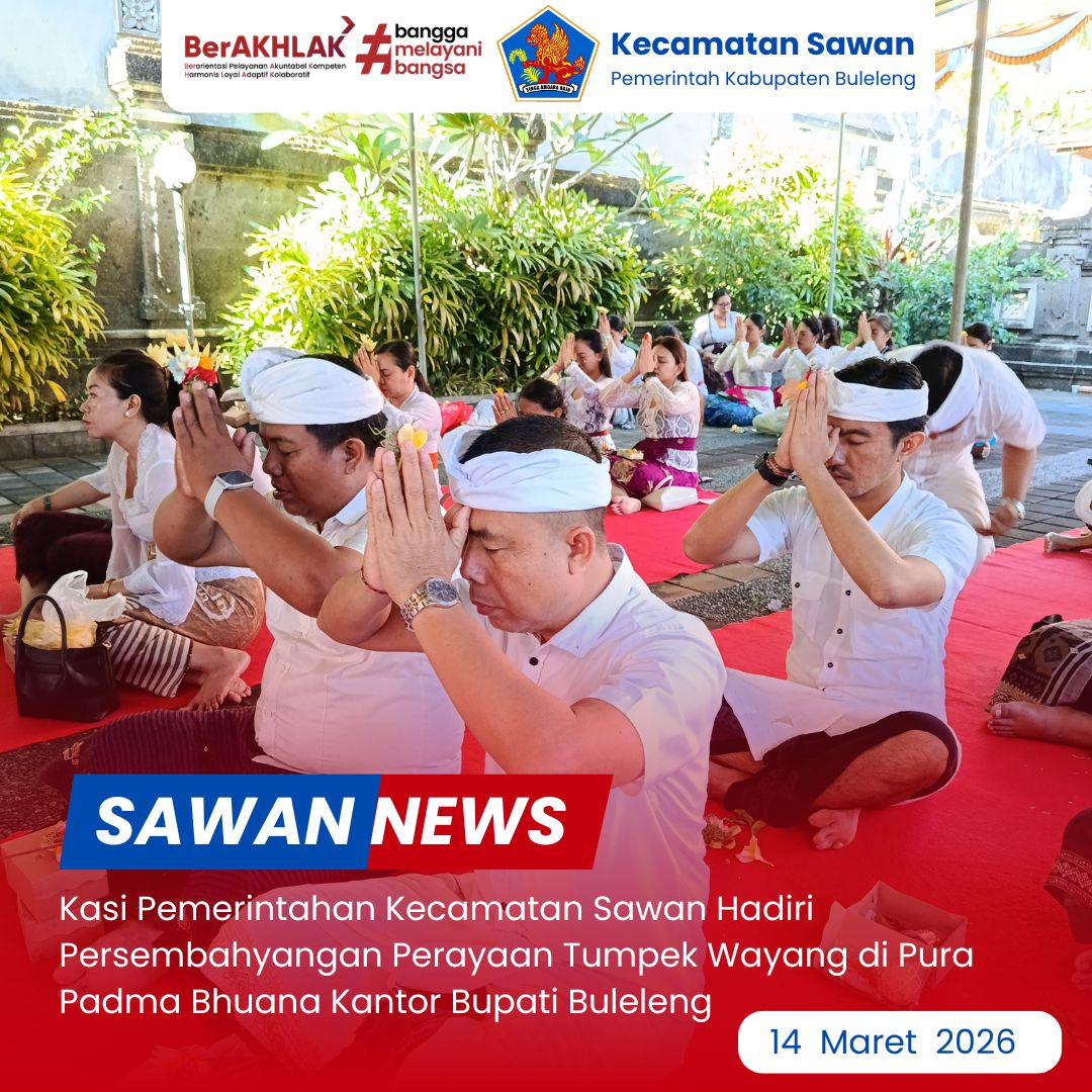 Hari ini Sabtu, 14 Maret 2026 Kasi Pemerintahan Kecamatan Sawan Made Suastika, S.Sos menghadiri kegiatan persembahyangan bersama dalam rangka perayaan Tumpek Wayang yang dilaksanakan di Pura Padma Bhuana Kantor Bupati Buleleng.