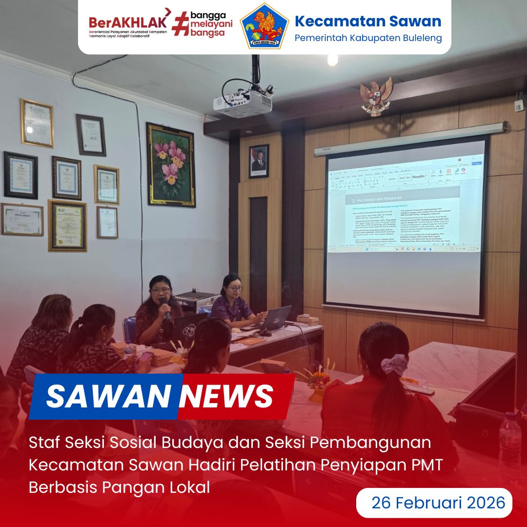 Hari ini Kamis, 26 Februari 2026 Staf Seksi Sosial dan Budaya Kecamatan Sawan menghadiri kegiatan Pelatihan Tim Pelaksana dalam Penyiapan Pemberian Makanan Tambahan (PMT) berbasis pangan lokal bagi ibu hamil KEK, ibu hamil risiko KEK, balita, serta balita gizi kurang. Kegiatan ini dilaksanakan di ruang pertemuan Puskesmas Sawan I.