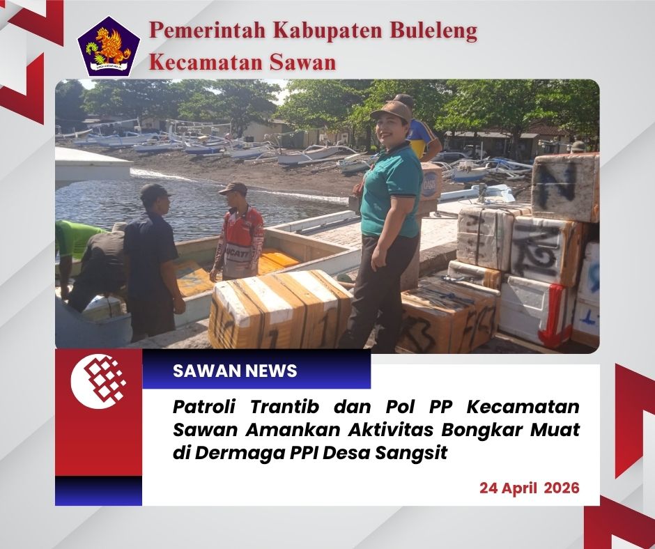 Hari ini Jumat, 24 April 2026, staf Seksi Ketentraman dan Ketertiban (Trantib) dan Satuan Polisi Pamong Praja (Pol PP) Kecamatan Sawan melaksanakan patroli pengamanan di Dermaga PPI Desa Sangsit. Kegiatan ini dilakukan bertepatan dengan bersandarnya kapal barang KM. AVEN SELON GT.30 No. 311/NP/2018 Ka No. 8136/L yang berasal dari Desa Sepeken, Madura.