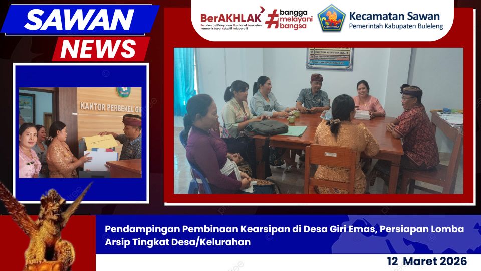 Hari ini Kamis 12 Maret 2026 Kasubag Umum dan Keuangan Kecamatan Sawan, Luh Karyani, S.Sos, melaksanakan kegiatan pendampingan pembinaan kearsipan dari Dinas Arsip dan Perpustakaan Daerah Kabupaten Buleleng yang bertempat di Kantor Desa Giri Emas.