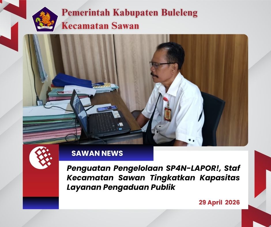 Hari ini Rabu, 29 April 2026, staf Seksi Pelayanan Administrasi Terpadu Kecamatan Sawan mengikuti kegiatan Penguatan Pengelolaan SP4N-LAPOR! dalam Tata Kelola Mikro yang diselenggarakan secara virtual oleh Kementerian PANRB.