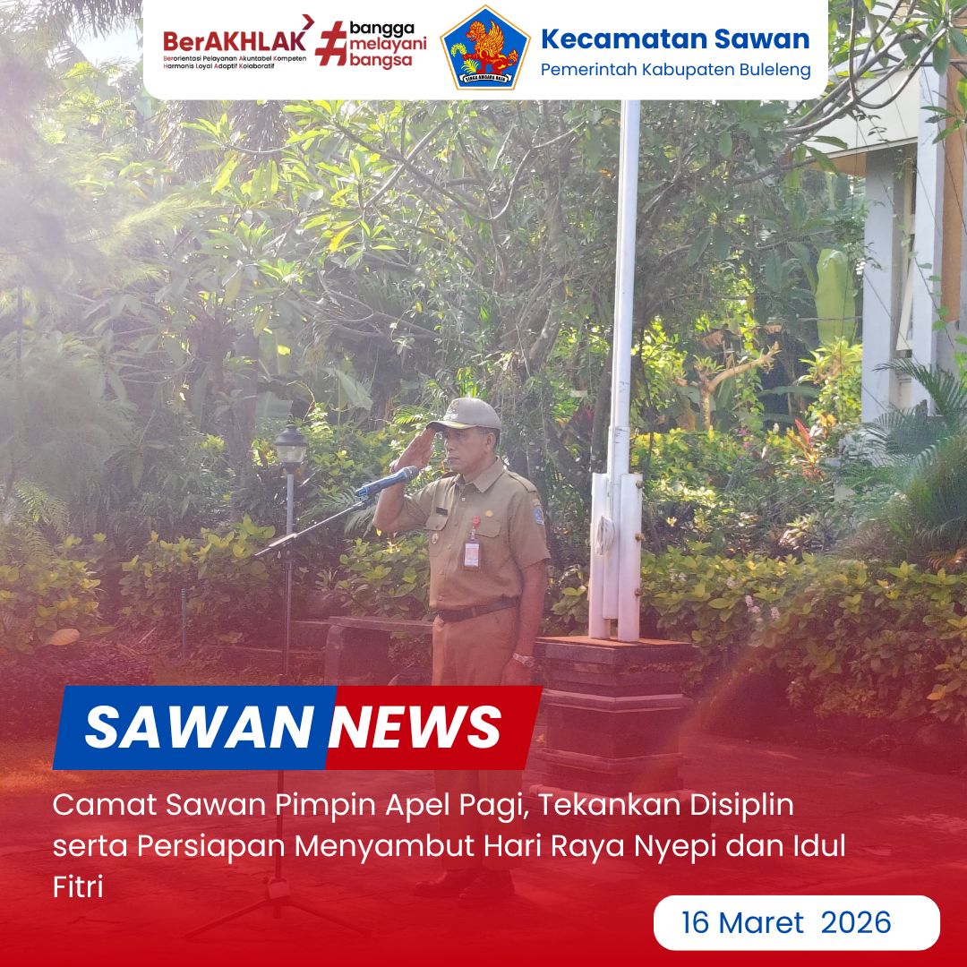 Hari ini Senin, 16 Maret 2026, Camat Sawan I Ketut Cantyana, SP memimpin pelaksanaan apel pagi yang berlangsung di halaman Kantor Camat Sawan. Apel pagi ini diikuti oleh seluruh pegawai di lingkungan Kantor Camat Sawan, pegawai PKH, serta pegawai PLKB Kecamatan Sawan.
