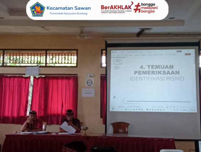 Hari ini Kamis, 22 Januari 2026 Pemerintah Kecamatan Sawan menggelar Rapat Focus Group Discussion (FGD) terkait identifikasi risiko strategis sebagai tindak lanjut Rencana Aksi (Action Plan) atas rekomendasi Inspektorat Daerah Kabupaten Buleleng. Kegiatan ini merupakan bagian dari implementasi hasil laporan penjaminan kualitas Maturitas Penyelenggaraan Sistem Pengendalian Intern Pemerintah (SPIP) Terintegrasi pada Pemerintah Kabupaten Buleleng.
