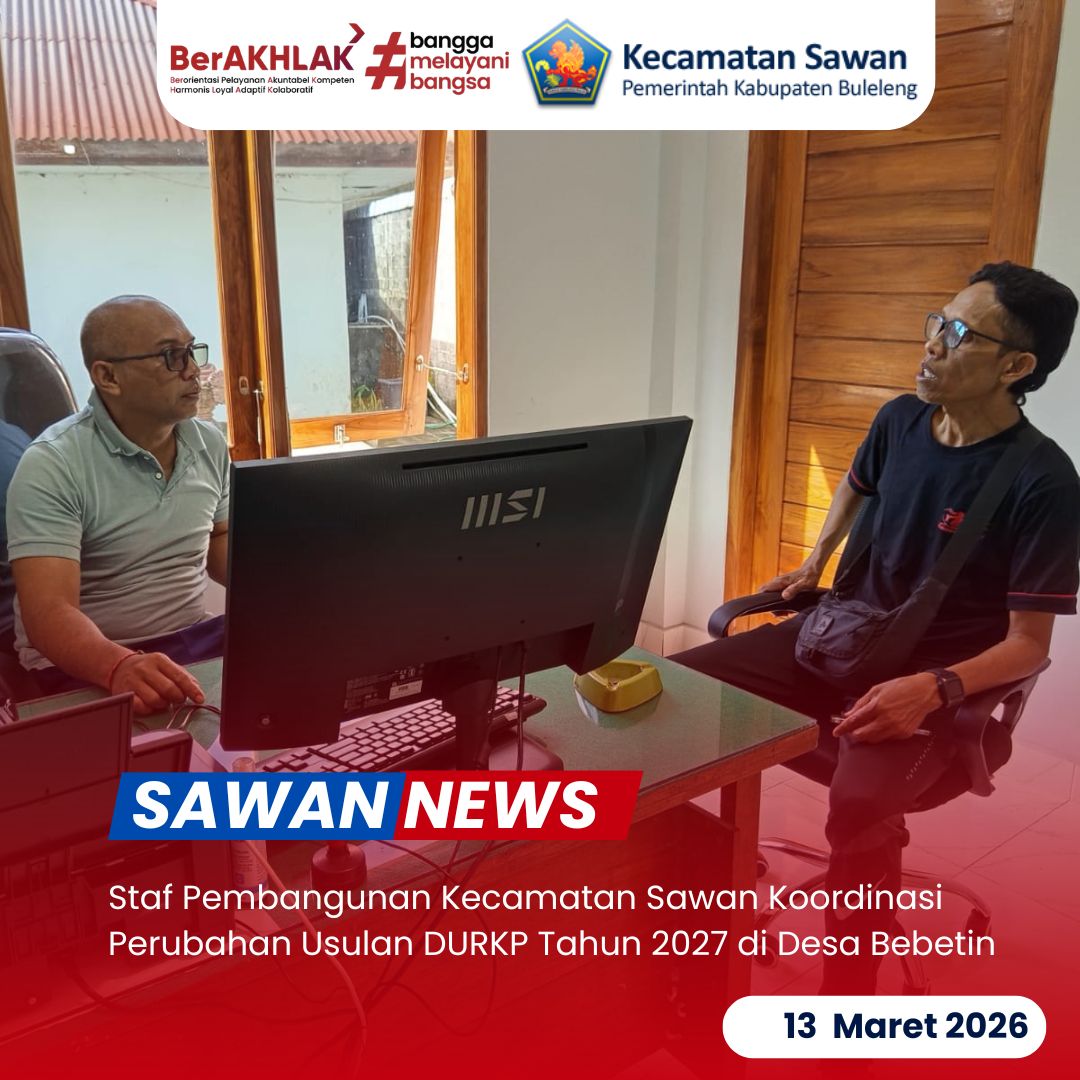 Hari ini Jumat, 13 Maret 2026 Staf Pembangunan Kecamatan Sawan melaksanakan kegiatan koordinasi terkait perubahan usulan Daftar Usulan Rencana Kegiatan Pembangunan (DURKP) Tahun 2027 di Desa Bebetin.