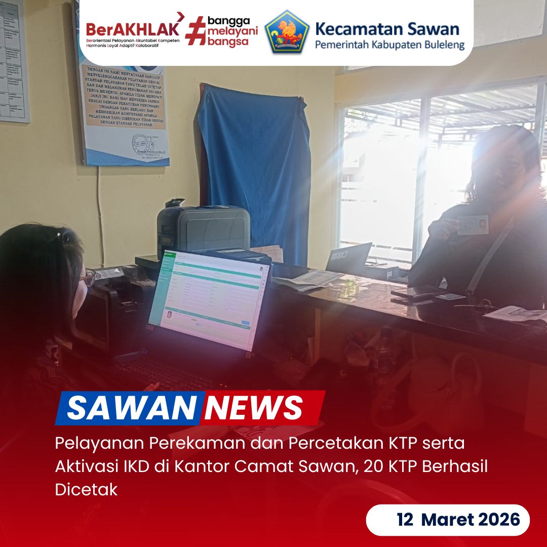 Hari ini Kamis 12 Maret 2026 Staf Kantor Camat Sawan melaksanakan kegiatan pelayanan perekaman dan percetakan Kartu Tanda Penduduk (KTP) serta pembukaan dan aktivasi Identitas Kependudukan Digital (IKD) yang bertempat di Ruang Pelayanan Kantor Camat Sawan.