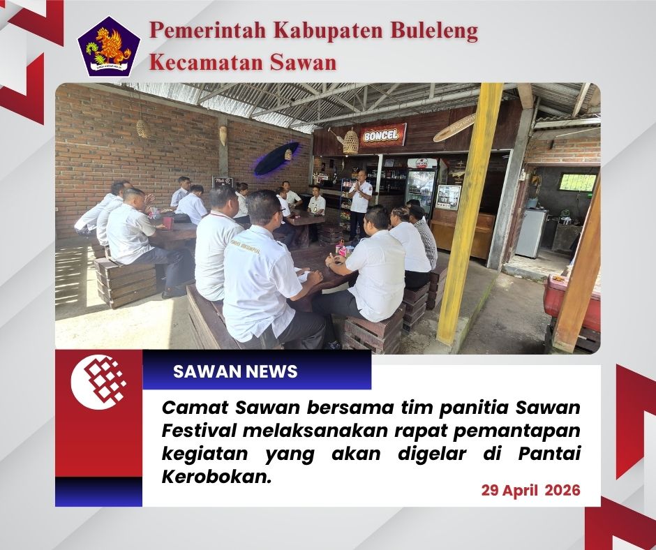 Hari ini Rabu, 29 April 2026 Camat Sawan, I Ketut Cantyana, SP., bersama tim panitia Sawan Festival melaksanakan rapat pemantapan kegiatan yang akan digelar di Pantai Kerobokan. Festival tersebut direncanakan berlangsung pada tanggal 22–24 Mei 2026 mendatang.
