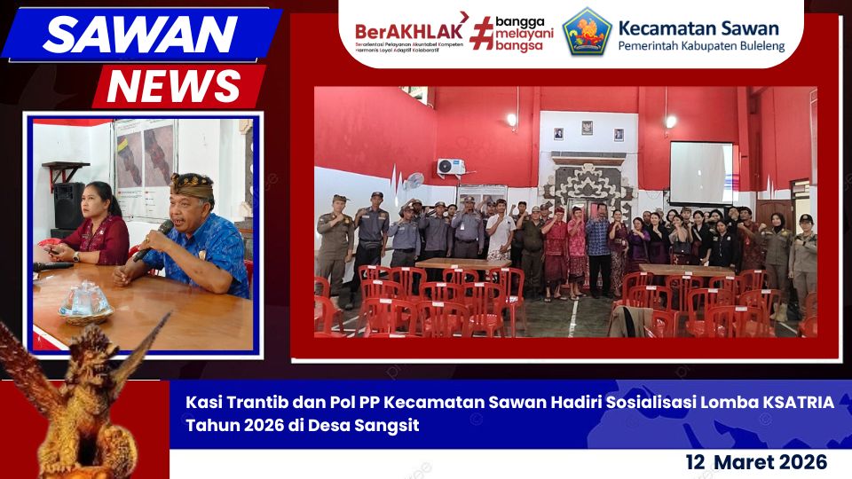 Hari ini Kamis 12 Maret 2026 Kasi Ketentraman, Ketertiban (Trantib) dan Pol PP Kecamatan Sawan, Made Sutiastawa, SH bersama staf Trantib Bidang Linmas menghadiri undangan Sosialisasi KSATRIA Tahun 2026 yang bertempat di Aula Kantor Perbekel Desa Sangsit.