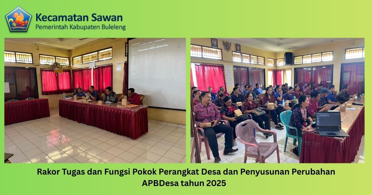 Hari ini selasa, 23 september 2025 Kasi Pemerintahan Kecamatan Sawan Made Suastika, S.Sos membuka acara rapat koordinasi terkait tugas dan fungsi pokok perangkat desa sesuai Permendagri 84 tahun 2015, dan pengelolaan keuangan dan penyusunan perubahan APBDesa tahun 2025 di aula Kantor Camat Sawan. Kegiatan ini dilaksanakan dalam upaya meningkatkan sinergi dan pemahaman dalam pengelolaan keuangan desa serta menindaklanjuti kebijakan terbaru terkait perubahan Anggaran Pendapatan dan Belanja Desa (APBDesa) Tahun Anggaran 2025 serta mengkoordinasikan langkah-langkah strategis dalam pelaksanaan perubahan APBDesa 2025, terutama menyangkut skala prioritas penggunaan dana desa. Hadir dalam kegiatan ini para Sekretaris Desa dan perangkat desa yang membidangi terkait perencanaan dan keuangan dari 14 desa di Kecamatan Sawan.