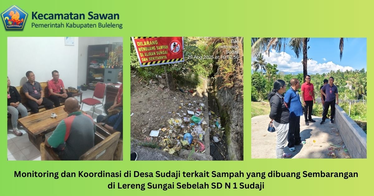 Hari ini jumat, 29 Agustus 2025 Sekcam Sawan Gde Agus Ngurah Suryawan, S.Sos bersama Plt. Kasi Pelayanan Terpadu Made Suastika, S.Sos dan staf melakukan monitoring dan koordinasi ke Kantor Perbekel Desa Sudaji terkait sampah yang dibuang sembarangan di lereng sungai sebelah SD N 1 Sudaji. Dalam monitoring ini diterima langsung Perbekel Desa Sudaji, Kelian Banjar Dinas Desa dan Perangkat Desa .