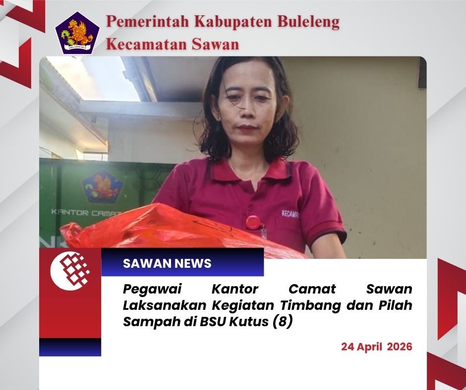 Hari ini Jumat, 24 April 2026, seluruh pegawai Kantor Camat Sawan melaksanakan kegiatan timbang dan pilah sampah di Bank Sampah Unit (BSU) Kutus (8) yang berada di lingkungan Kantor Camat Sawan. Kegiatan ini merupakan bagian dari upaya nyata dalam mendukung pengelolaan sampah berbasis sumber sekaligus meningkatkan kesadaran akan pentingnya menjaga kebersihan lingkungan.