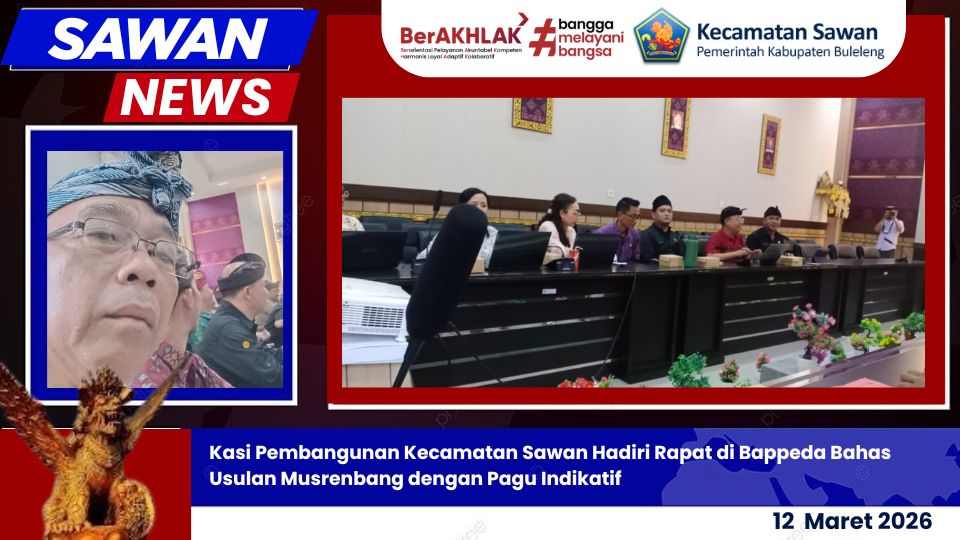 Hari ini Kamis 12 Maret 2026 Kasi Pembangunan Kecamatan Sawan, Wayan Mahayasa, menghadiri rapat pembahasan usulan Musyawarah Perencanaan Pembangunan (Musrenbang) dengan pagu indikatif yang dilaksanakan di Kantor Badan Perencanaan Pembangunan Daerah (Bappeda) Kabupaten Buleleng.