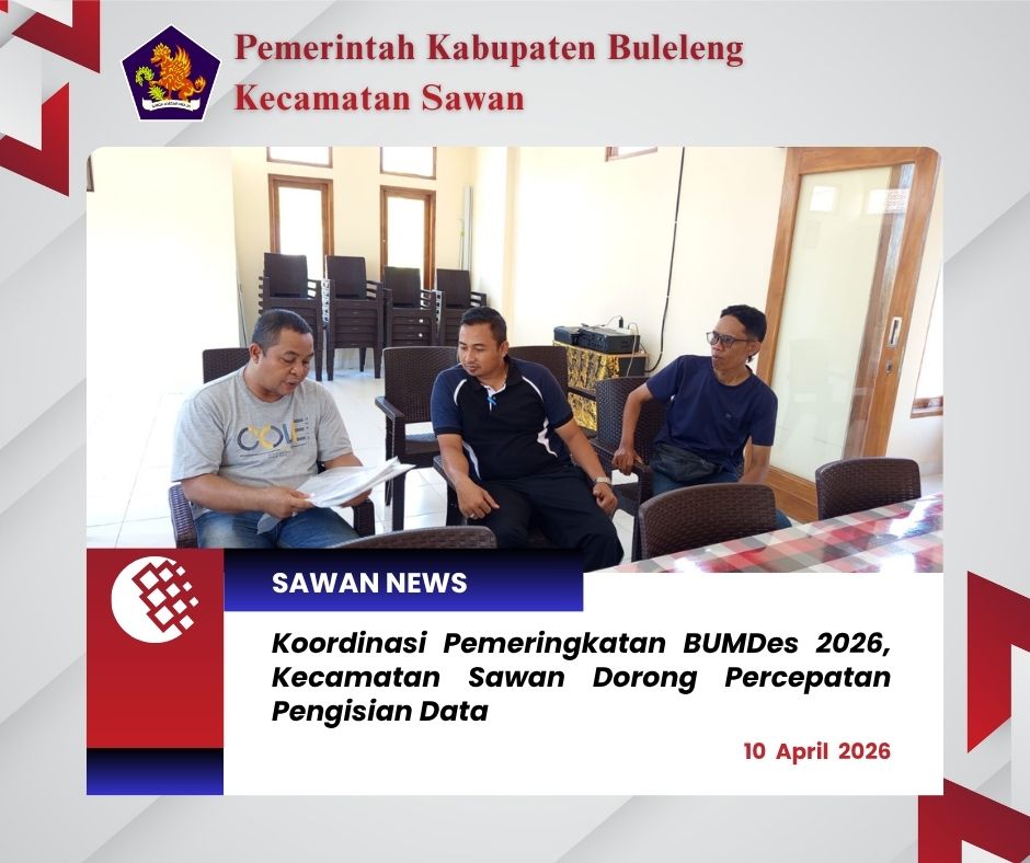 Hari ini Jumat, 10 April 2026, staf Seksi Pembangunan Kecamatan Sawan melaksanakan kegiatan koordinasi terkait pemeringkatan Badan Usaha Milik Desa (BUMDes) Tahun 2026. Kegiatan ini dilaksanakan di Desa Suwug dan Desa Sudaji sebagai bagian dari upaya percepatan dan optimalisasi pengisian data pemeringkatan BUMDes.
