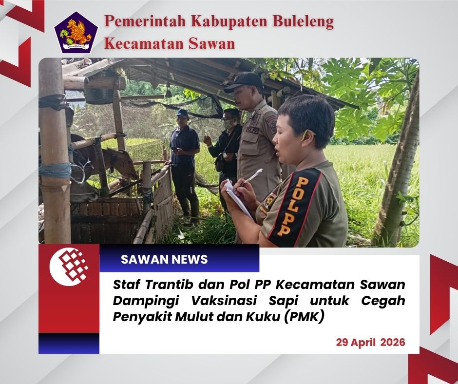 Hari ini Rabu, 29 Maret 2026, staf Seksi Ketentraman dan Ketertiban Umum (Trantib) dan Satuan Polisi Pamong Praja (Pol PP) Kecamatan Sawan melaksanakan pendampingan kegiatan vaksinasi ternak sapi sebagai upaya pencegahan Penyakit Mulut dan Kuku (PMK) di wilayah Desa Sangsit.
