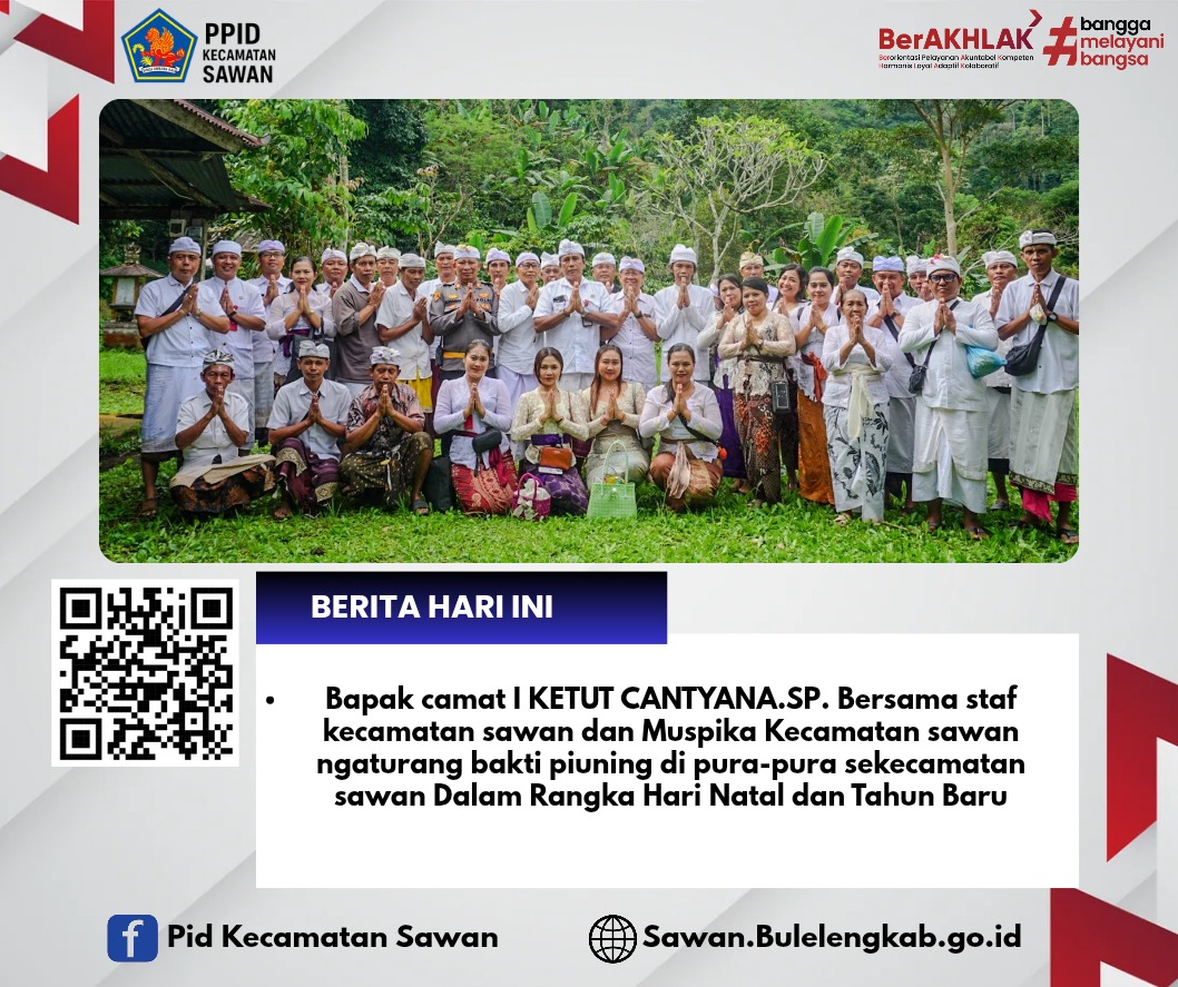 Hari ini kamis, 4 desember 2025 Camat Sawan I Ketut Cantyana, SP bersama staf melaksanakan persembahyangan akhir tahun di 7 ( tujuh ) pura yang berada wilayah kecamatan Sawan. Kegiatan persembahyangan ini dalam rangka memohon keselamatan dan keamanan di wilayah Kecamatan Sawan dalam rangka natal dan menjelang tahun baru 2026.