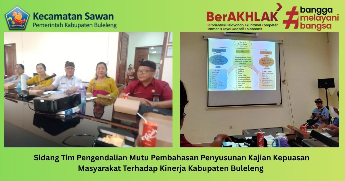 Kamis,16 oktober 2025 Plt. Kasi Pelayaan Terpadu Kecamatan Sawan Luh Rupini, S.Sos menghadiri sidang tim pengendalian mutu pembahasan penyusunan kajian kepuasan masyarakat terhadap kinerja Kabupaten Buleleng yang bertempat di ruang rapat badan riset dan inovasi daerah kabupaten buleleng. Acara dibuka Kepala Badan Riset dan Inovasi Daerah Kabupaten Buleleng Drs. Made Supartawan, MM serta dihadiri oleh beberapa OPD, Camat se-Kabupaten Buleleng, Ketua Agama Hindu Mpu Kuturan serta dari Universitas Panji Sakti.