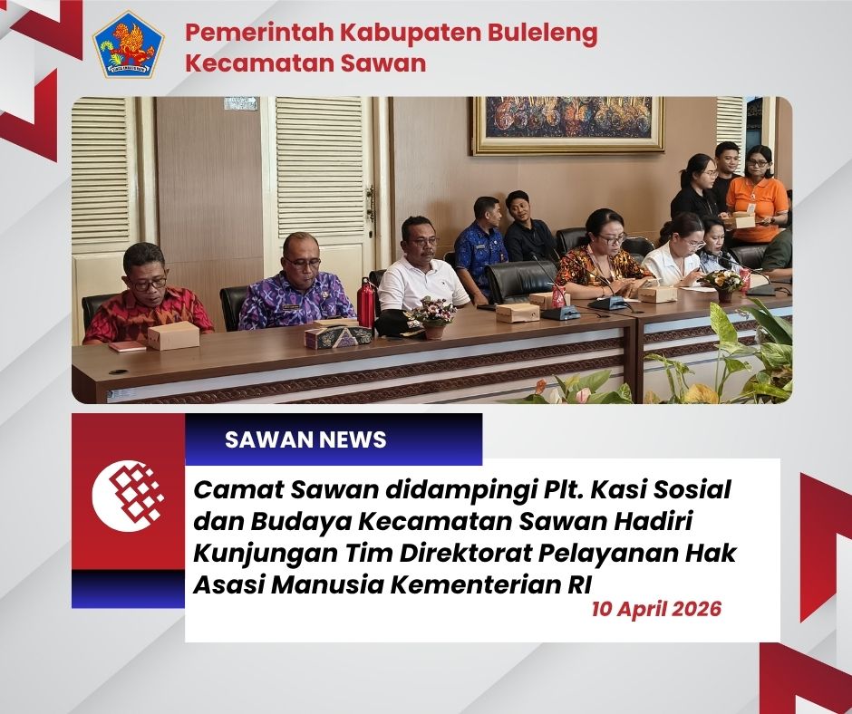 Hari ini Jumat, 10 April 2026 Camat Sawan I Ketut Cantyana, SP, bersama Plt. Kasi Sosial dan Budaya Kecamatan Sawan Gede Mudiarsa, S.Sos menghadiri kegiatan kunjungan Tim Direktorat Pelayanan Hak Asasi Manusia (HAM) Kementerian Republik Indonesia terkait kasus dugaan kekerasan fisik dan seksual terhadap anak yang terjadi di Lembaga Kesejahteraan Sosial Anak (LKSA). Kegiatan ini berlangsung di Kantor Bupati Buleleng.