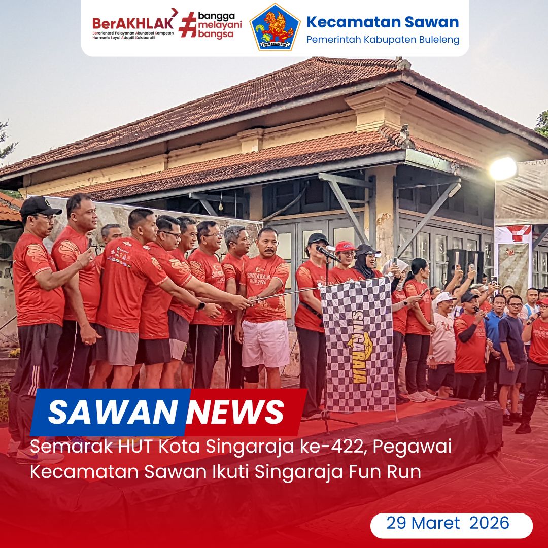 Hari ini Minggu 29 Maret 2026 Dalam rangka memeriahkan Hari Ulang Tahun (HUT) Kota Singaraja ke-422 tahun 2026, seluruh pegawai Kecamatan Sawan turut ambil bagian dalam kegiatan Singaraja Fun Run yang berlangsung meriah dan penuh semangat.