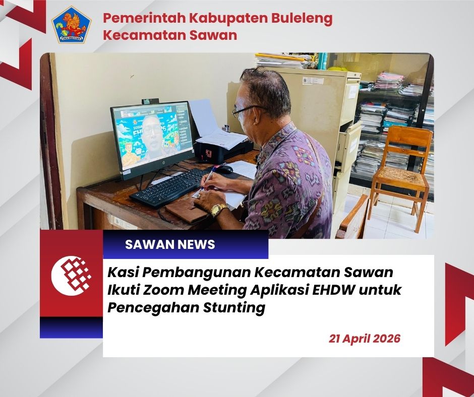 Hari ini Selasa, 21 April 2026 Pembangunan Kecamatan Sawan, Wayan Mahayasa, mengikuti kegiatan zoom meeting yang diselenggarakan oleh DPMDPPKB Kabupaten Buleleng. Kegiatan ini membahas pemanfaatan aplikasi EHDW (Electronic Human Development Worker) sebagai upaya mendukung percepatan pencegahan stunting di tingkat desa.