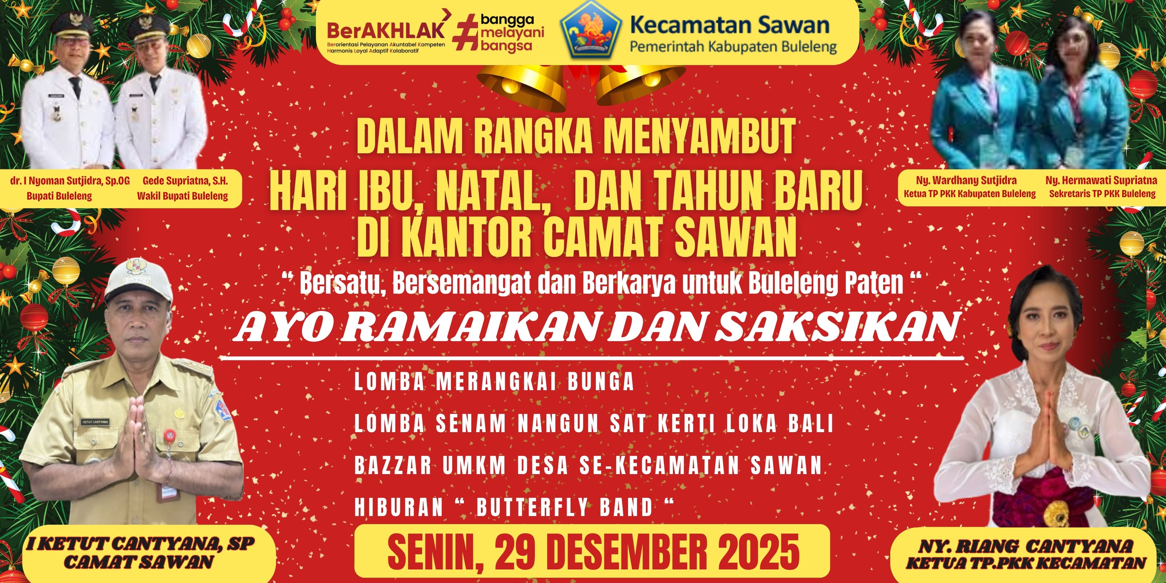 Ayo warga masyarakat Kecamatan Sawan, datang dan saksikan beramai - ramai pada senin, 29 desember 2025 dalam rangka menyambut Hari Ibu, Natal dan Tahun Baru 2026 di Halaman Kantor Camat Sawan, akan diadakan :