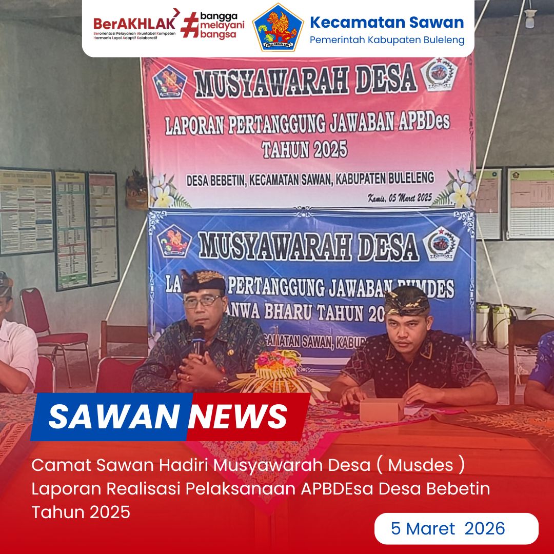 Hari ini Kamis, 5 Maret 2026 Camat Sawan I Ketut Cantyana, SP bersama Kasi Pemerintahan Kecamatan Sawan Made Suastika, S.Sos menghadiri kegiatan Musyawarah Desa (Musdes) Laporan Realisasi Pelaksanaan Anggaran Pendapatan dan Belanja Desa (APBDes) Tahun 2025 yang dilaksanakan di Kantor Desa Bebetin, Kecamatan Sawan.