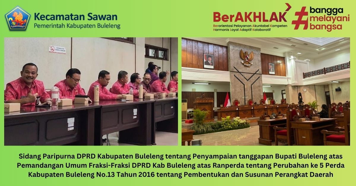 Hari ini selasa,16 Oktober 2025 sekcam sawan Gde Agus Ngurah Suryawan, S.Sos mewakili Camat Sawan I Made Wirama Satria, SE menghadiri Sidang Paripurna DPRD Kabupaten Buleleng tentang Penyampaian tanggapan Bupati Buleleng atas Pemandangan Umum Fraksi-Fraksi DPRD Kab Buleleng atas Ranperda tentang Perubahan ke 5 Perda Kabupaten Buleleng No.13 Tahun 2016 tentang Pembentukan dan Susunan Perangkat Daerah.