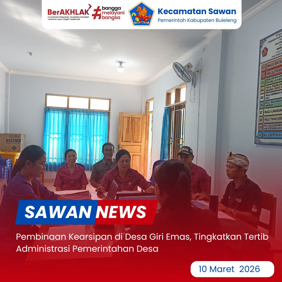 Hari ini Selasa, 10 Maret 2026, Kasubag Umum dan Keuangan Kecamatan Sawan Luh Karyani, S.Sos bersama staf melaksanakan kegiatan pembinaan kearsipan di Desa Giri Emas, Kecamatan Sawan.