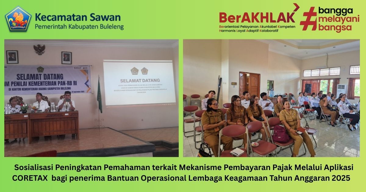 Hari ini senin, 29 september 2025 staf sub bagian umum dan keuangan kantor camat sawan menghadiri Kegiatan Sosialisasi peningkatan pemahaman terkait mekanisme pembayaran pajak melalui aplikasi CORETAX bagi penerima Bantuan Operasional Lembaga Keagamaan Tahun Anggaran 2025 yang bertempat di Kantor Kementrian Agama Kabupaten Buleleng .