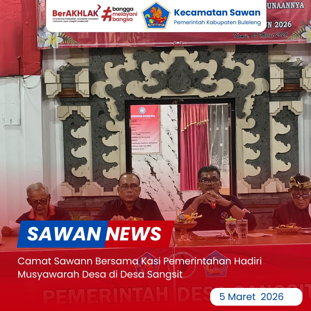 Hari ini Kamis, 5 Maret 2026 Camat Sawan I Ketut Cantyana, SP bersama Kasi Pemerintahan Made Suastika, S.Sos menghadiri kegiatan pembahasan dan penyepakatan besaran Anggaran Dana Desa yang ditentukan penggunaannya untuk Tahun Anggaran 2026, sekaligus Musyawarah Desa Penetapan Keluarga Penerima Manfaat (KPM) Bantuan Langsung Tunai Dana Desa (BLT-DD) Tahun 2026 yang dilaksanakan di Kantor Desa Sangsit, Kecamatan Sawan.