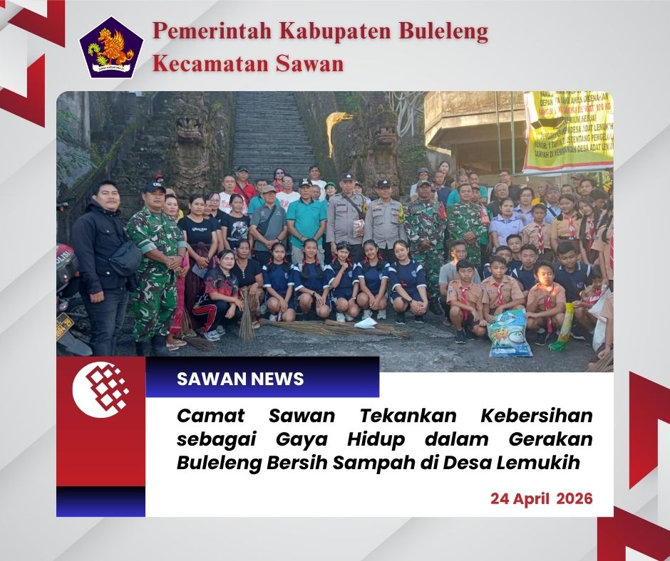 Hari ini Jumat, 24 April 2026, Camat Sawan I Ketut Cantyana, SP bersama staf pegawai Kantor Camat Sawan melaksanakan kegiatan Gerakan Buleleng Bersih Sampah yang dipusatkan di Jaba Pura Desa Lemukih. Kegiatan ini merupakan bagian dari upaya berkelanjutan dalam menjaga kebersihan lingkungan serta menumbuhkan kesadaran masyarakat akan pentingnya pengelolaan sampah.