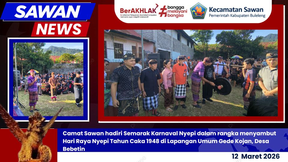 Hari ini Kamis, 12 Maret 2026, Camat Sawan I Ketut Cantyana, SP menghadiri kegiatan Semarak Karnaval Nyepi dalam rangka menyambut Hari Raya Nyepi Tahun Caka 1948 yang diselenggarakan oleh Komunitas Belajar Gugus II Teratai Cendekia. Kegiatan tersebut berlangsung meriah di Lapangan Umum Gede Kojan, Desa Bebetin, Kecamatan Sawan, Kabupaten Buleleng.