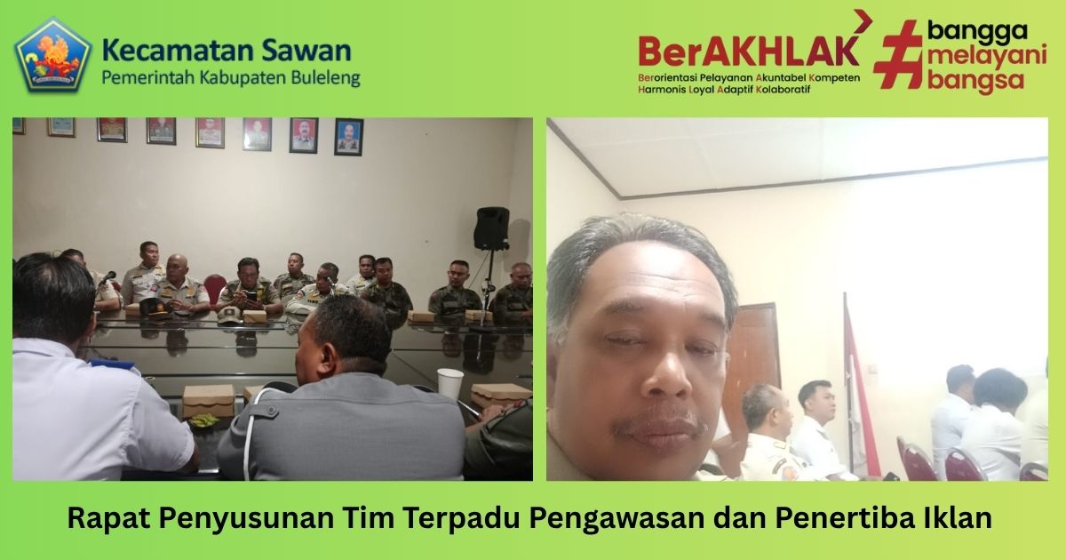 Hari ini rabu, 22 oktober 2025 Kasi Trantib dan Pop PP Kecamatan Sawan Made Sutiastawa, SH menghadiri Rapat Penyusunan Tim Terpadu Pengawasan dan Penertiba Iklan di ruang rapat Satpol PP Kabupaten Buleleng. Rapat dibuka dan dipimpin langsung Kepala Satuan Polisi Pamong Praja Kabupaten Buleleng I Gede Arya Suardana, AP, MM.