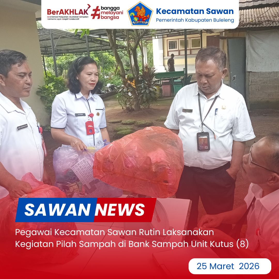 Hari ini Rabu, 25 Maret 2026, seluruh pegawai Kantor Camat Sawan melaksanakan kegiatan timbang dan pilah sampah yang bertempat di Sekretariat Bank Sampah Unit Kutus (8) Kantor Camat Sawan. Kegiatan ini merupakan agenda rutin yang dilaksanakan setiap hari Rabu dan Jumat setiap minggunya.