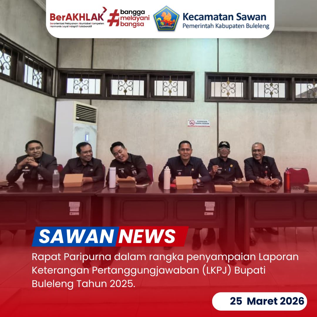 Hari ini Rabu, 25 Maret 2026, Camat Sawan I Ketut Cantyana, SP., menghadiri Rapat Paripurna dalam rangka penyampaian Laporan Keterangan Pertanggungjawaban (LKPJ) Bupati Buleleng Tahun 2025. Kegiatan tersebut berlangsung di ruang sidang DPRD Kabupaten Buleleng dan dibuka langsung oleh Ketua DPRD Buleleng Ketut Ngurah Arya, S.M.