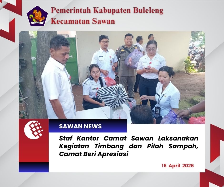 Hari ini Rabu, 15 April 2026, seluruh staf Kantor Camat Sawan melaksanakan kegiatan timbang dan pilah sampah yang bertempat di Bank Sampah Unit (BSU) Kutus (8) Kantor Camat Sawan. Kegiatan ini merupakan bagian dari upaya meningkatkan kesadaran dan kepedulian terhadap pengelolaan sampah berbasis sumber serta mendukung program pelestarian lingkungan.