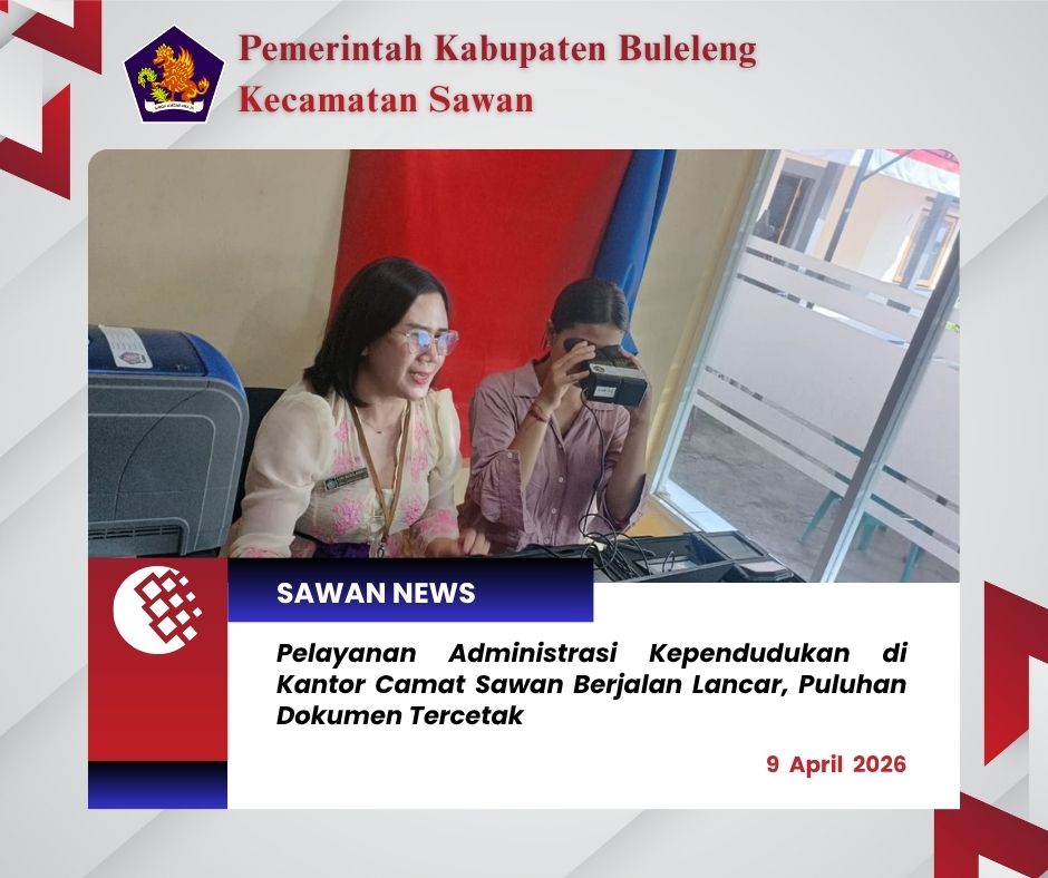 Hari ini Kamis, 9 April 2026 Pelayanan administrasi kependudukan di Kantor Camat Sawan pada hari Kamis, 9 April 2026, berjalan dengan lancar dan tertib. Staf kecamatan terus memberikan pelayanan optimal kepada masyarakat dalam hal pencetakan dokumen kependudukan serta perekaman data.