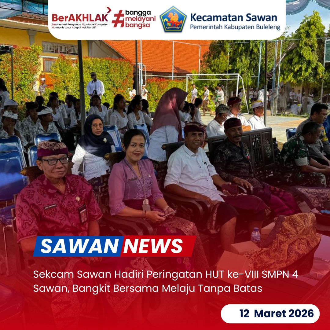 Hari ini Kamis, 12 Maret 2026, Sekretaris Camat Sawan, Gde Agus Ngurah Suryawan menghadiri kegiatan peringatan Hari Ulang Tahun ke-VIII SMP Negeri 4 Sawan yang dirangkaikan dengan berbagai lomba antar siswa kelas VII dan VIII. Kegiatan tersebut dilaksanakan di lingkungan sekolah dengan suasana penuh semangat dan kebersamaan.