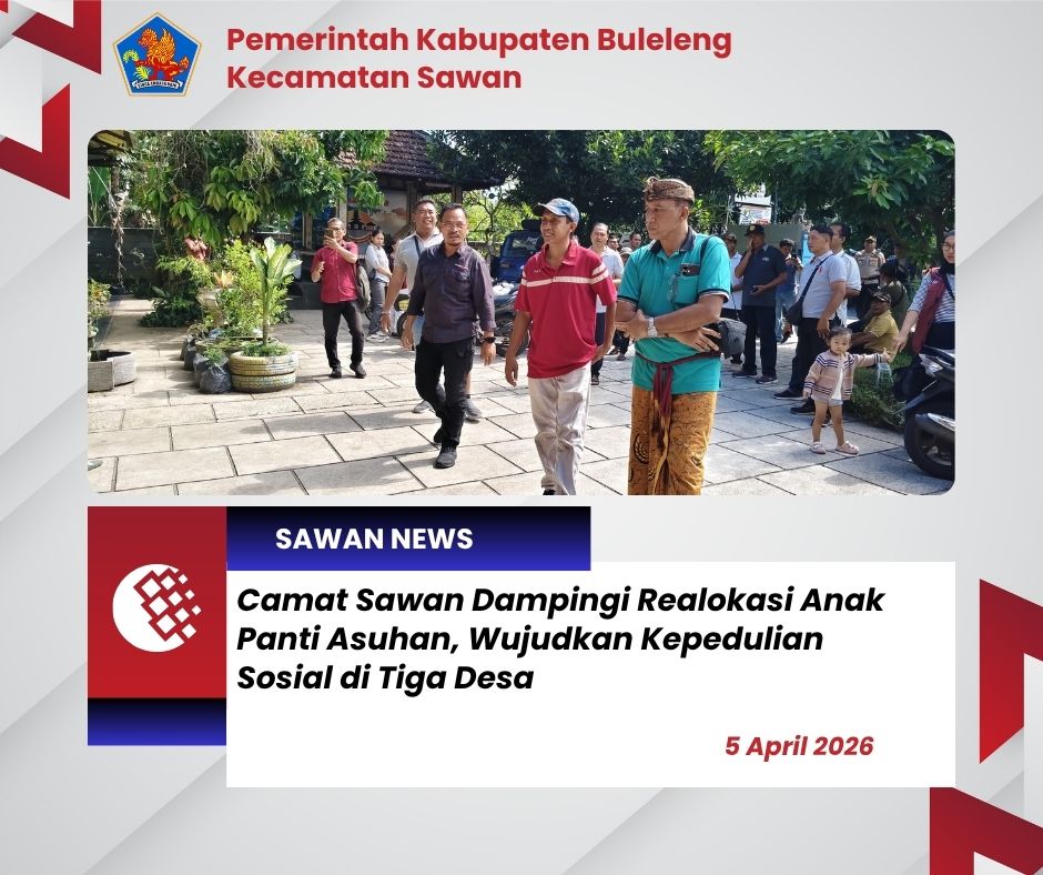 Hari ini Minggu, 5 April 2026, Camat Sawan I Ketut Cantyana, SP mendampingi Kepala Dinas Sosial Pemberdayaan Perempuan dan Perlindungan Anak Kabupaten Buleleng dalam kegiatan realokasi anak-anak panti asuhan. Kegiatan ini dilaksanakan sebagai upaya penataan serta peningkatan kesejahteraan anak-anak panti asuhan di wilayah Kabupaten Buleleng.
