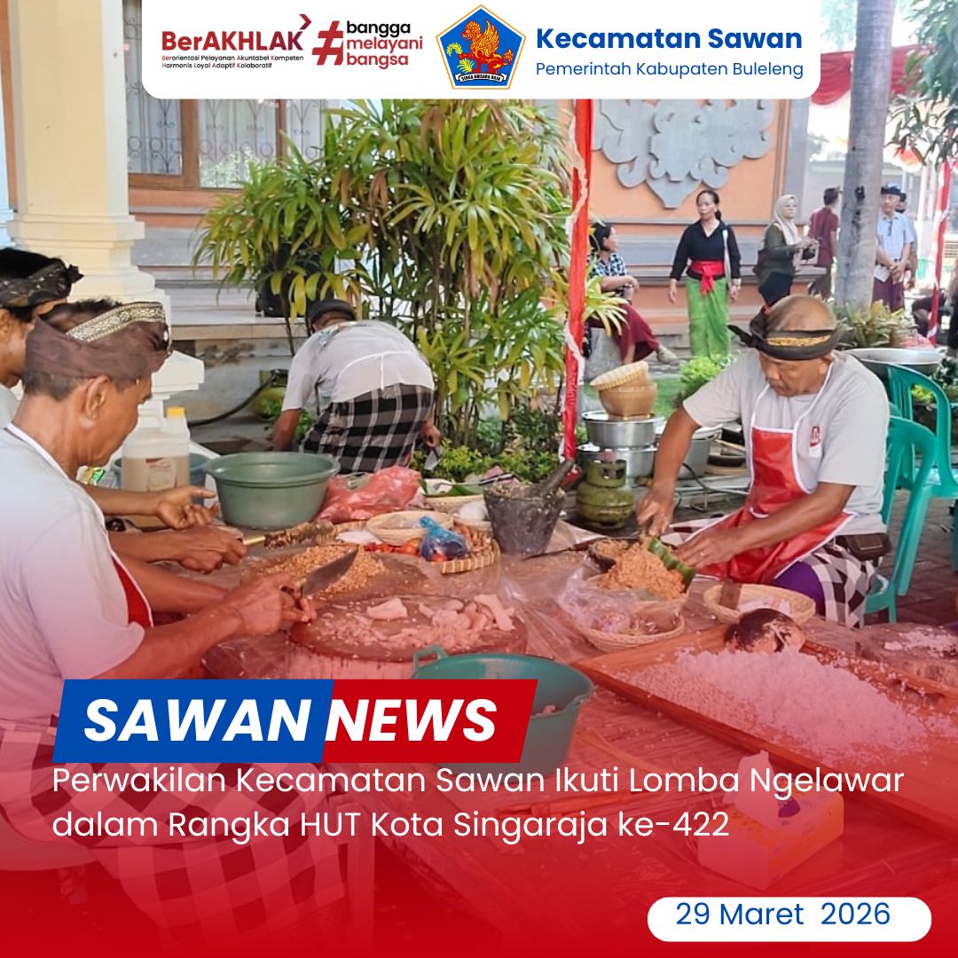 Hari ini Minggu, 29 Maret 2026 Pemerintah Kecamatan Sawan yang diwakili oleh Desa Giri Emas turut ambil bagian dalam Lomba Ngelawar yang diselenggarakan di Rumah Jabatan Bupati Buleleng. Kegiatan ini merupakan salah satu rangkaian perayaan Hari Ulang Tahun (HUT) Kota Singaraja ke-422 tahun 2026.