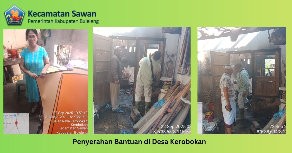 Hari ini senin, 22 September 2025, menindaklanjuti kejadian kebakaran rumah di Desa Kerobokan pada jumat, 19 september 2025 dua anggota staf trantib pol pp kecamatan sawan mendampingi dari tim analisis kebencanaan assesment BPBD ( I Gede Mahendra, S T. MM) Kabupaten Buleleng menyerahkan bantuan sementara kepada korban.
