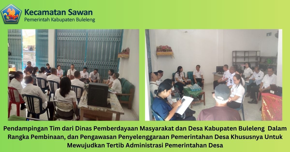 Hari ini rabu, 3 september, 2025, Kasi Pembangunan Kecamatan Sawan Wayan Mahayasa, Kasi Pemerintahan Kecamatan Sawan Made Suastika, S.Sos bersama Plt. Kasi Pelayanan Terpadu Luh Rupini,S.Sos, dampingi Tim dari Dinas Pemberdayaan Masyarakat dan Desa ( PMD ) Kabupaten Buleleng dalam hal ini yang hadir Luh Wartami, S. Sos bersama staf dalam rangka Pembinaan, dan Pengawasan Penyelenggaraan Pemerintahan Desa khususnya untuk mewujudkan tertib Administrasi Pemerintahan Desa sesuai dengan Peraturan Menteri Dalam Negeri Nomor 47 Tahun 2016 tentang Administrasi Pemerintahan Desa di Desa Suwug.
