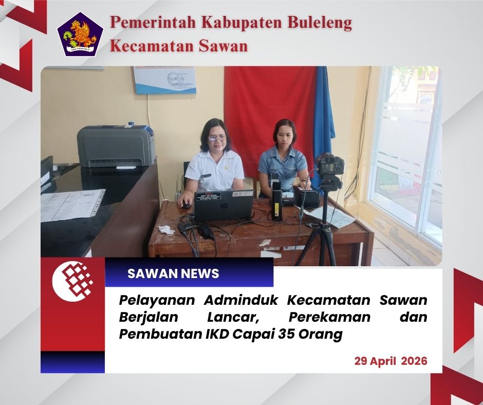 Hari ini Rabu, 29 April 2026 Staf Kecamatan Sawan kembali melaksanakan pelayanan administrasi kependudukan yang meliputi percetakan KTP elektronik, perekaman data, serta pembuatan Identitas Kependudukan Digital (IKD) di Kantor Camat Sawan.