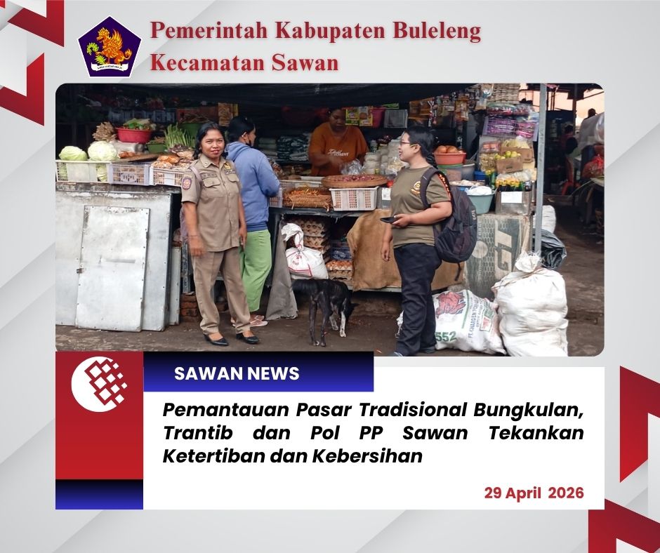 Hari ini Rabu, 29 April 2026, staf Seksi Ketentraman dan Ketertiban (Trantib) dan Satuan Polisi Pamong Praja (Pol PP) Kecamatan Sawan melaksanakan kegiatan pemantauan di Pasar Tradisional Desa Bungkulan.