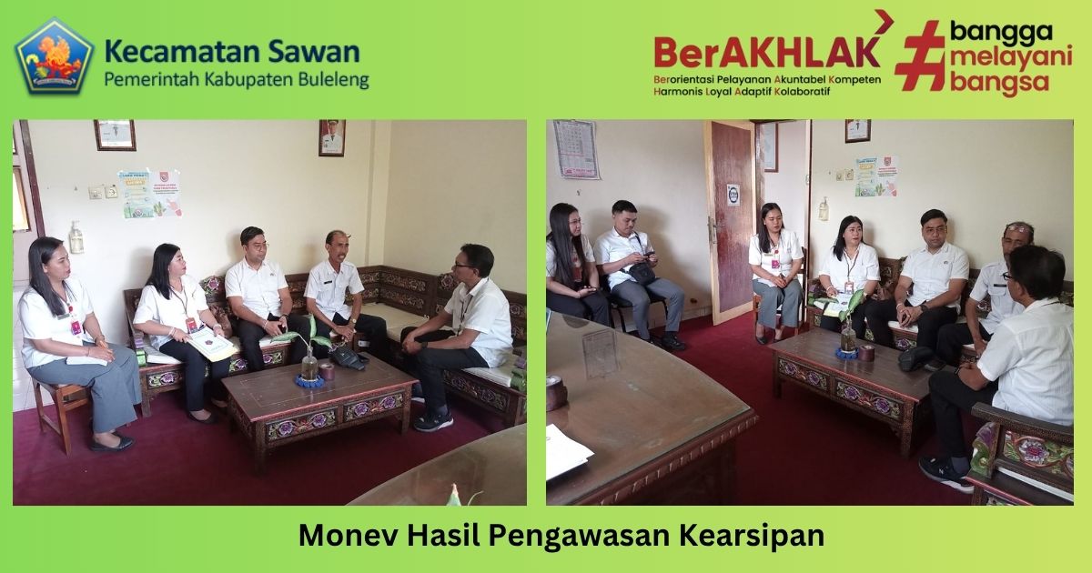 Hari ini rabu, 8 oktober 2025 Sekcam Sawan Gde Agus Ngurah Suryawan, S.Sos yang didampingi staf sub bagian umum dan keuangan yang membidangi kearsipan menerima kunjungan tim dari Dinas Arsip dan Perpustakaan Daerah Kabupaten Buleleng terkait monev hasil hasil pengawasan kearsipan. Kegiatan ini merupakan tindaklanjut pelaksanaan Pengawasan Kearsipan yang sudah dilakukan melalui Audit Sistem Kearsipan Internal (ASKI) Tahun 2025.