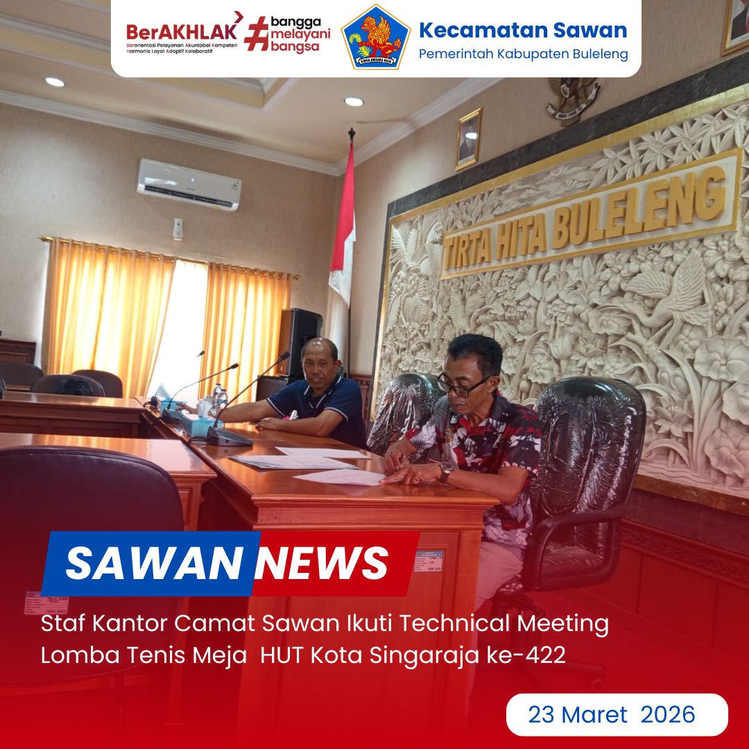 Hari ini Senin, 23 Maret 2026, staf Kantor Camat Sawan mengikuti kegiatan technical meeting lomba cabang olahraga tenis meja antar SKPD dalam rangka memperingati Hari Ulang Tahun Kota Singaraja ke-422 tahun 2026. Kegiatan ini dilaksanakan di Aula Perumda Air Minum Tirta Hita Buleleng.