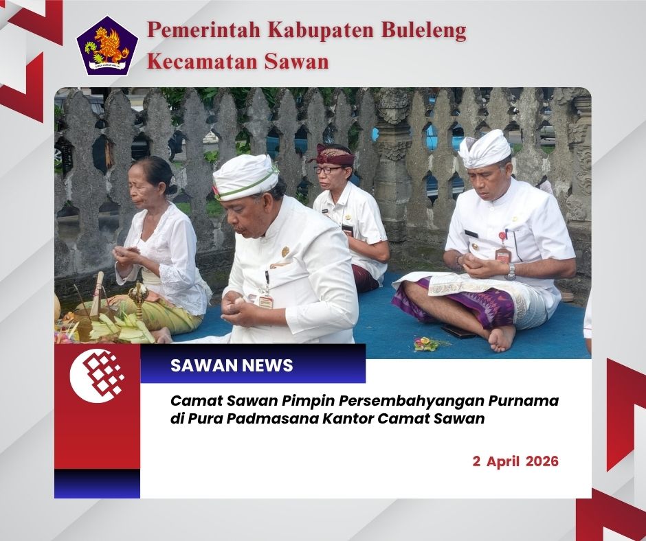 Hari ini Kamis 2 April 2026 Camat Sawan I Ketut Cantyana, SP didampingi Sekretaris Camat Sawan Gde Agus Ngurah Suryawan, S.Sos melaksanakan persembahyangan bersama di Pura Padmasana Kantor Camat Sawan yang bertepatan dengan Rahina Suci Purnama.