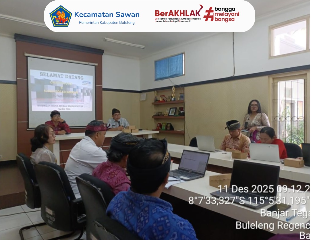 Hari ini kamis, 11 desember 2025 Kasi Pemerintahan Kecamatan Sawan Made Suastika, S.Sos bersama staf, menghadiri undangan Bimbingan Teknis Aplikasi Siskeudes Versi 2.0.8 yang dilaksanakan oleh Dinas Pemberdayaan Masyarakat dan Desa Kabupaten Buleleng di ruang rapat Pemberdayaan Masyarakat dan Desa Kabupaten Buleleng